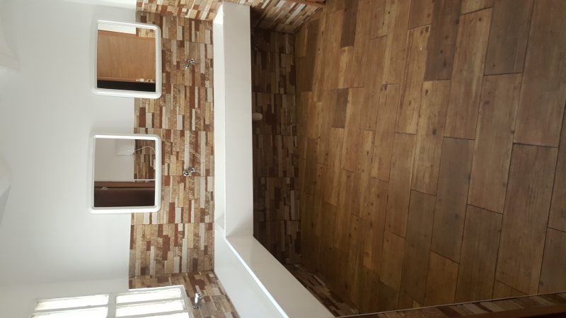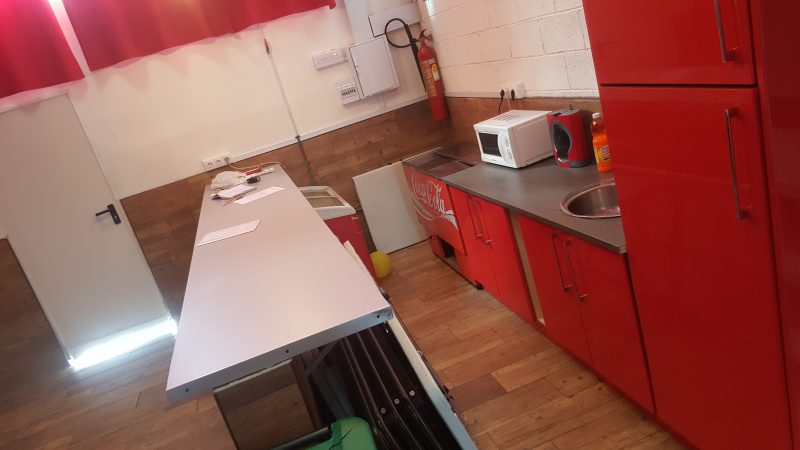 - Aigüera a la mateixa barra i armaris baixos. Estris de neteja i dues galledes d’escombraries grans.